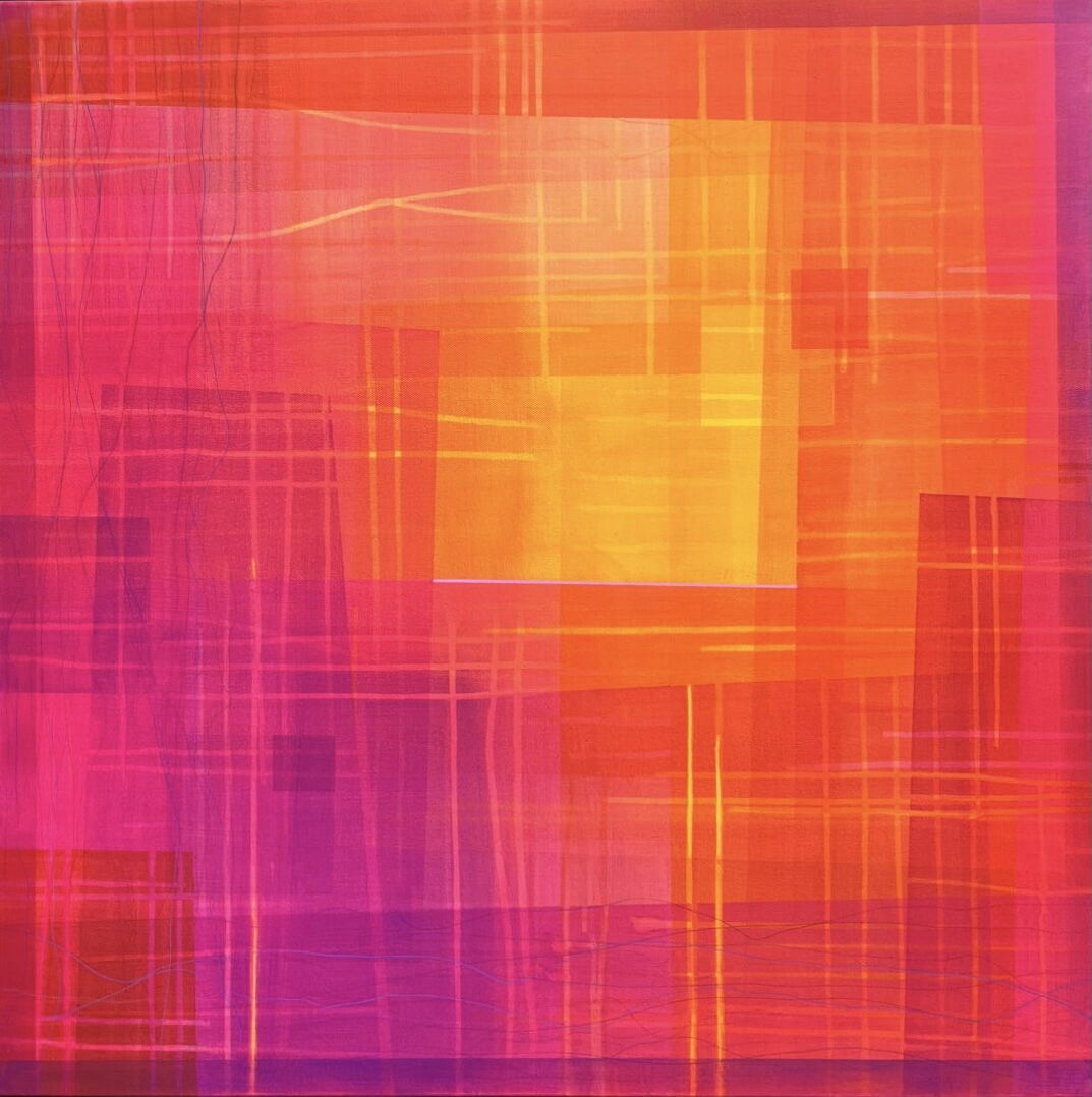 Abstract city scape - as days get hotter, nights get hotter, our cities become a little more uncomfortable and yet still retain the energy, vibrancy and buzz. This is a painting about our changing relationship to our warming world. Original, acrylic on canvas 90cm x 120cm.